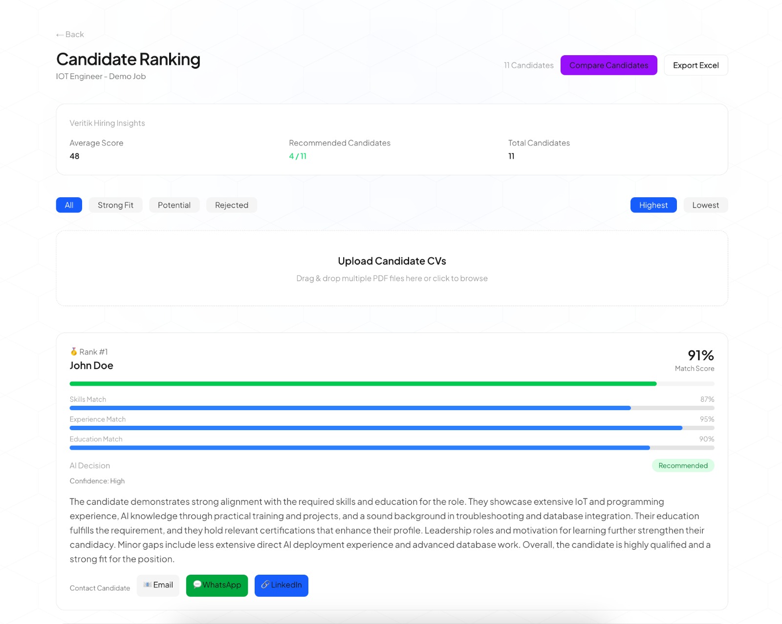 02Review your AI-ranked list, compare finalists with AI-backed insights, and contact candidates — all from a single unified workspace.